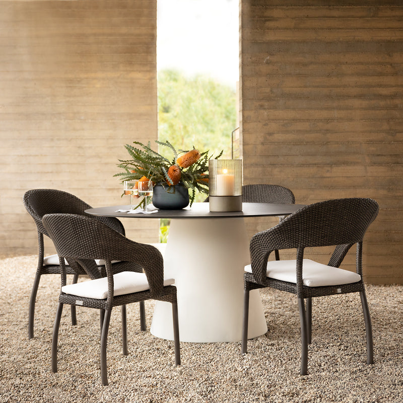 The Akuu collection is exquisitely handwoven in durable, exterior-friendly JANUSfiber over a sturdy aluminum frame and is defined by its signature, stylized curves. The poise and practicality of the Akuu chairs complements a variety of dining and lounge spaces.