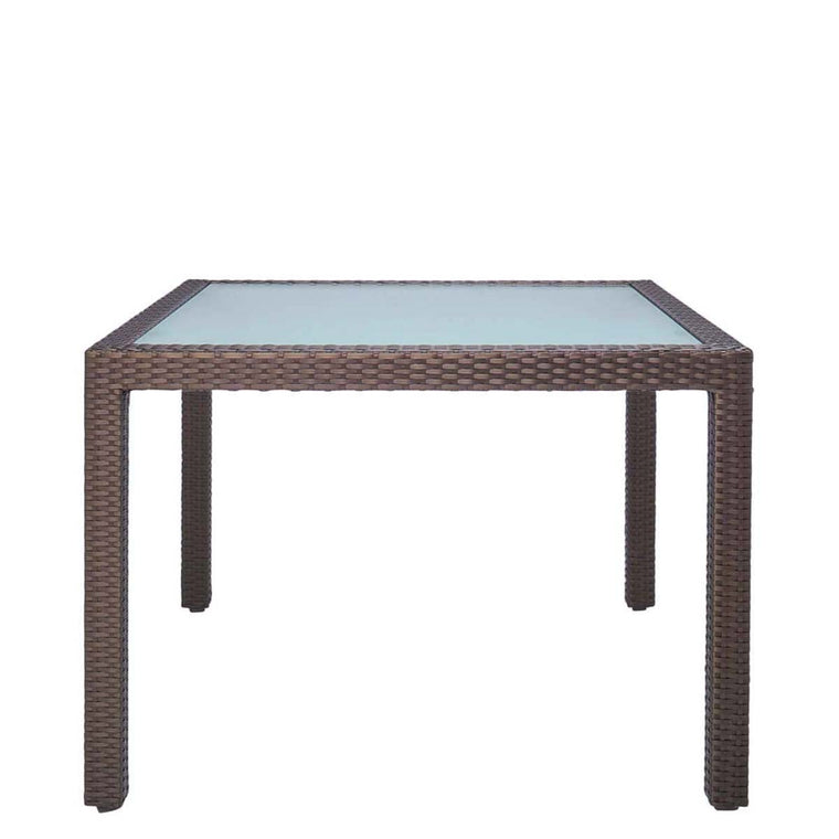 The Ascona Dining Table Square has an electrostatic powder coated aluminum frame with JANUSfiber weaving. An inset sanded glass top is included.