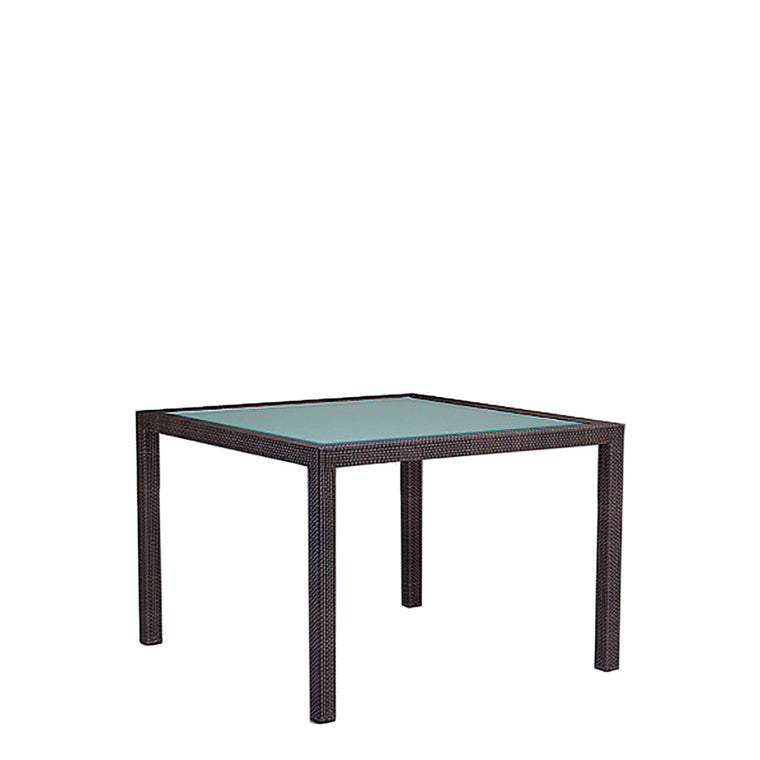 The Barcelona Dining Table is made of powder coated aluminum and synthetic fiber with an inset sanded glass top.