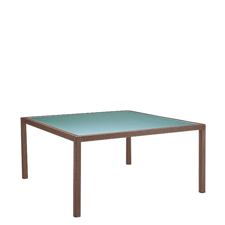 The Barcelona Dining Table is made of powder coated aluminum and synthetic fiber with an inset sanded glass top.