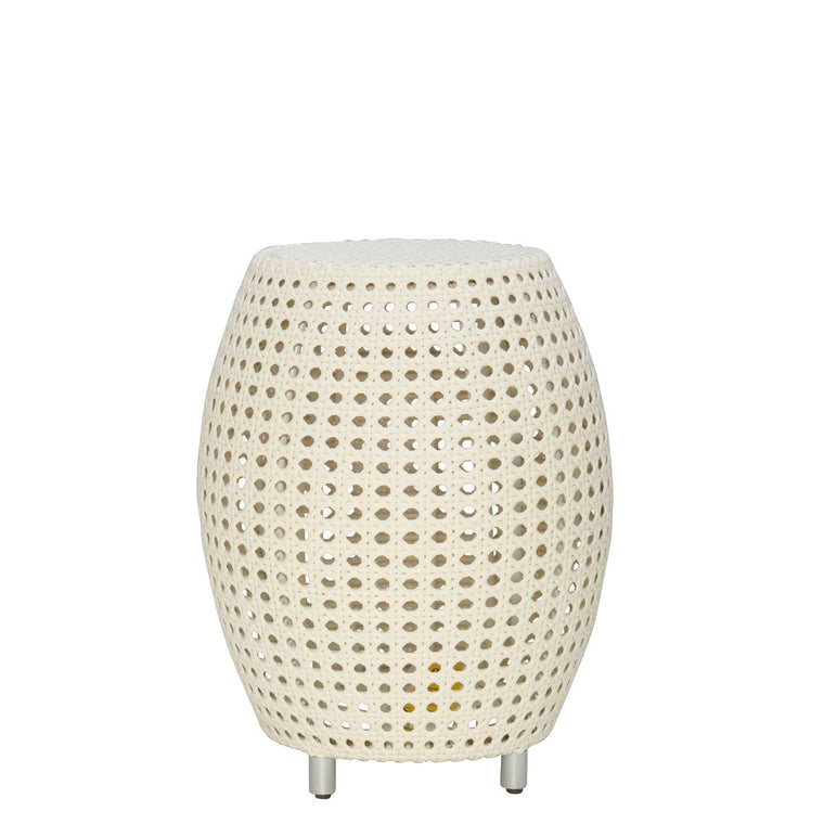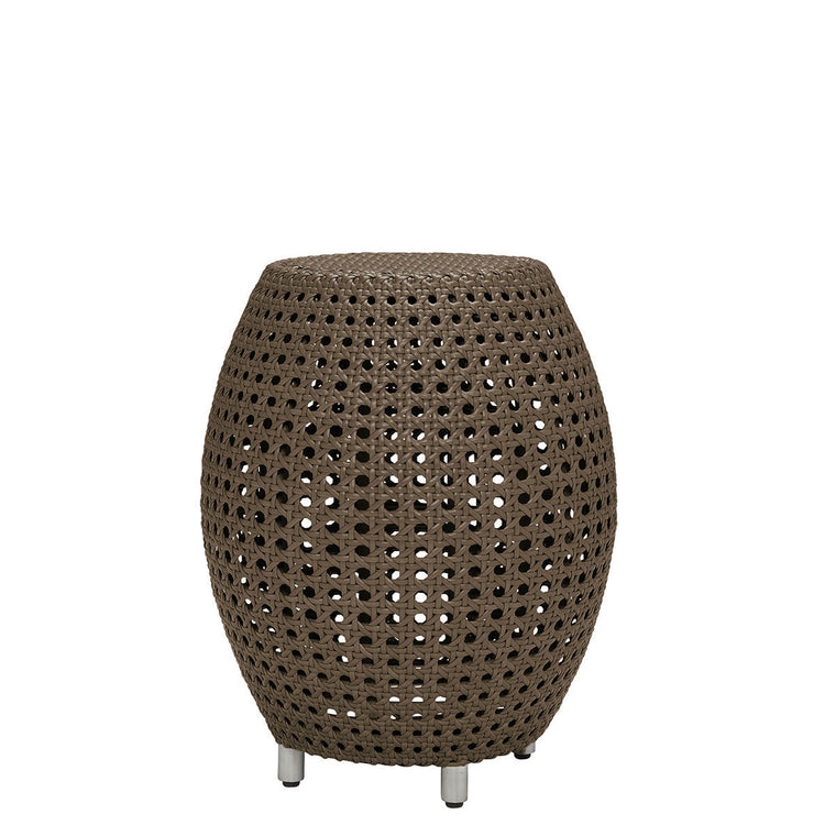 The Capsule Side Table and Nightstand combines garden latticework motifs with contemporary forms in powder-coated aluminum and JANUSfiber. Its side tables and benches features an open lattice network supported by brushed aluminum legs, available in three neutral hues, perfect for versatile outdoor and indoor settings.
