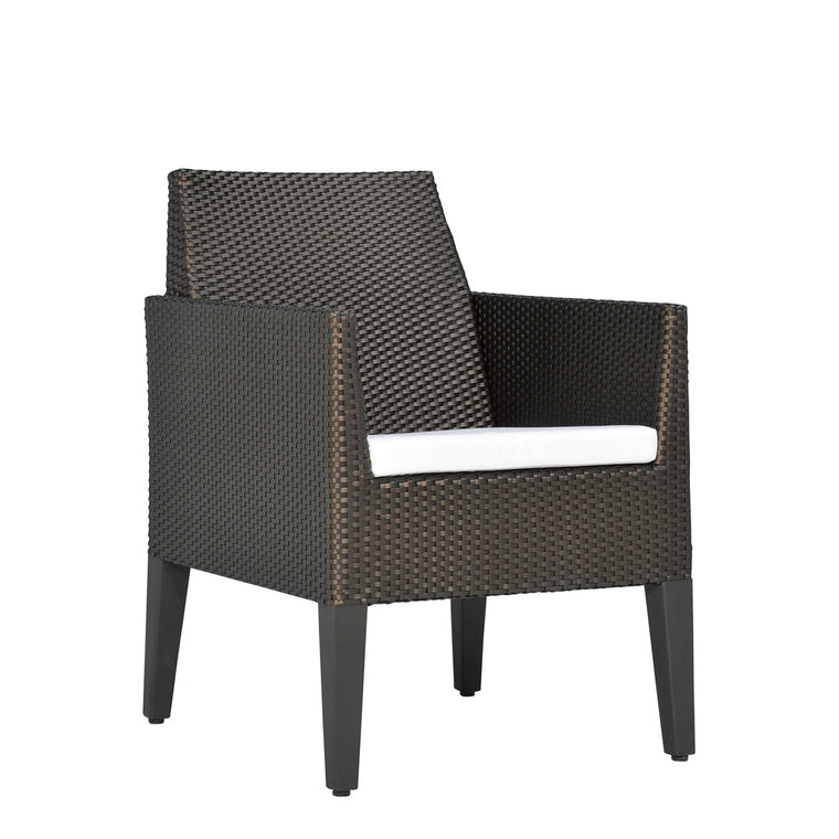 The Cortino Armchair - Bronze is constructed from a durable powder coated aluminum frame handwoven in our innovative JANUSfiber, engineered to withstand exposure to ultraviolet light and extreme weather conditions, allowing Cortino to be virtually maintenance free. It is finished in our deep brown Bronze color. The dining armchair features ergonomically styled armrests and pairs well with our woven fiber tables. A seat cushion is included in our Whitewash fabric. Cushions are pre-made and ready to ship with no additional lead time. The Cortino Collection offers a range of versatile dining and lounge pieces that complement both traditional and modern spaces alike.