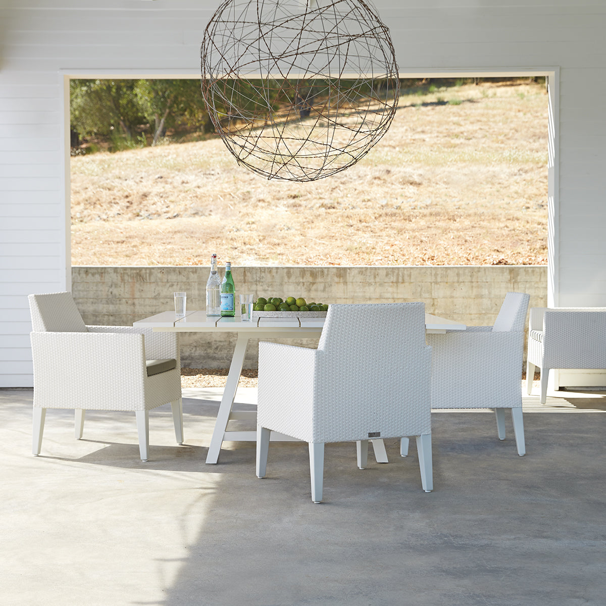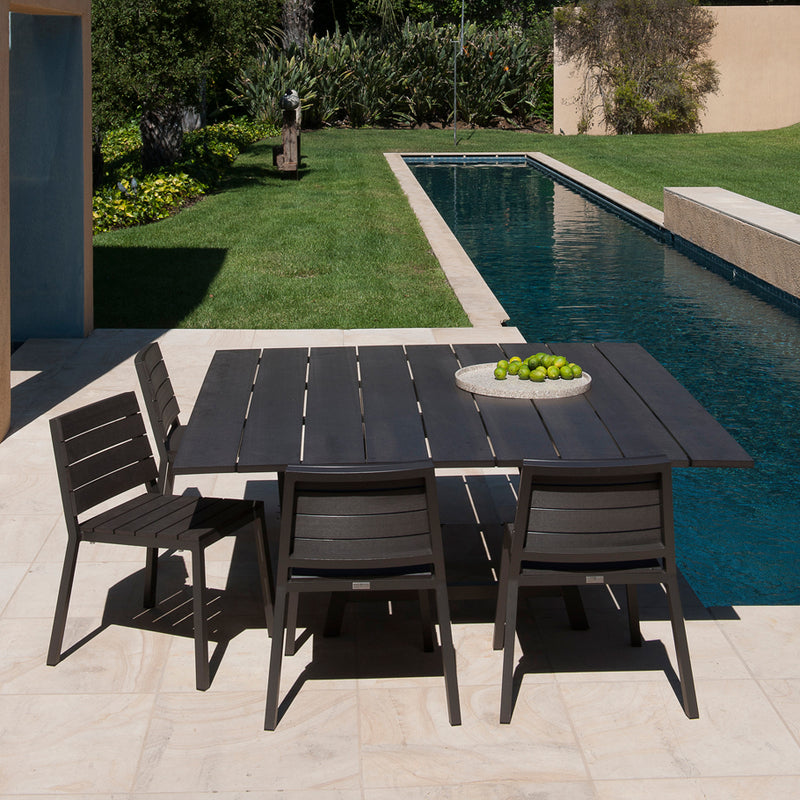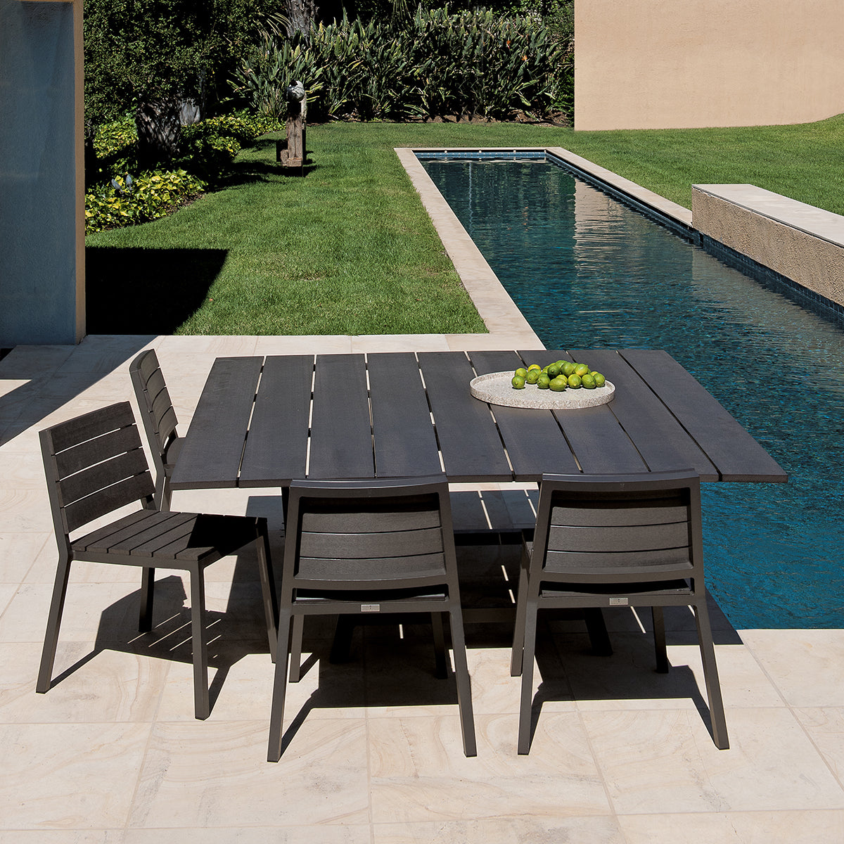 Generously sized to seat eight comfortably, the Dolce Vita Dining Table Square 160 is constructed of sleek, fade-resistant, taupe Wenge powder coated aluminum, and engineered to weather the elements beautifully.