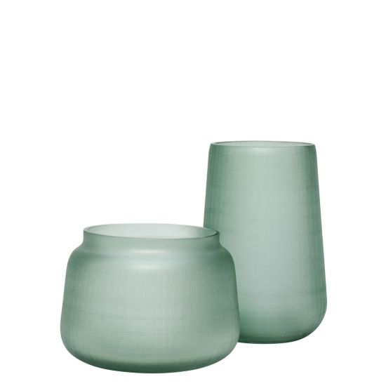 The Dupioni II Vase showcases a linen-like texture with a frosted sheen. Handcrafted in art glass, these vases are perfect for creating dramatic indoor or outdoor displays.