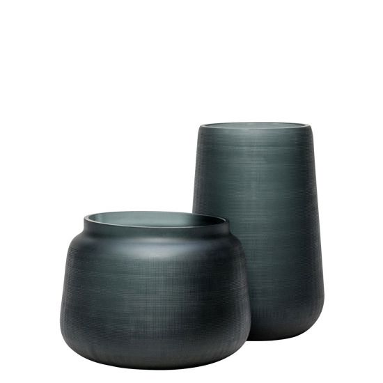 The Dupioni II Vase showcases a linen-like texture with a frosted sheen. Handcrafted in art glass, these vases are perfect for creating dramatic indoor or outdoor displays.