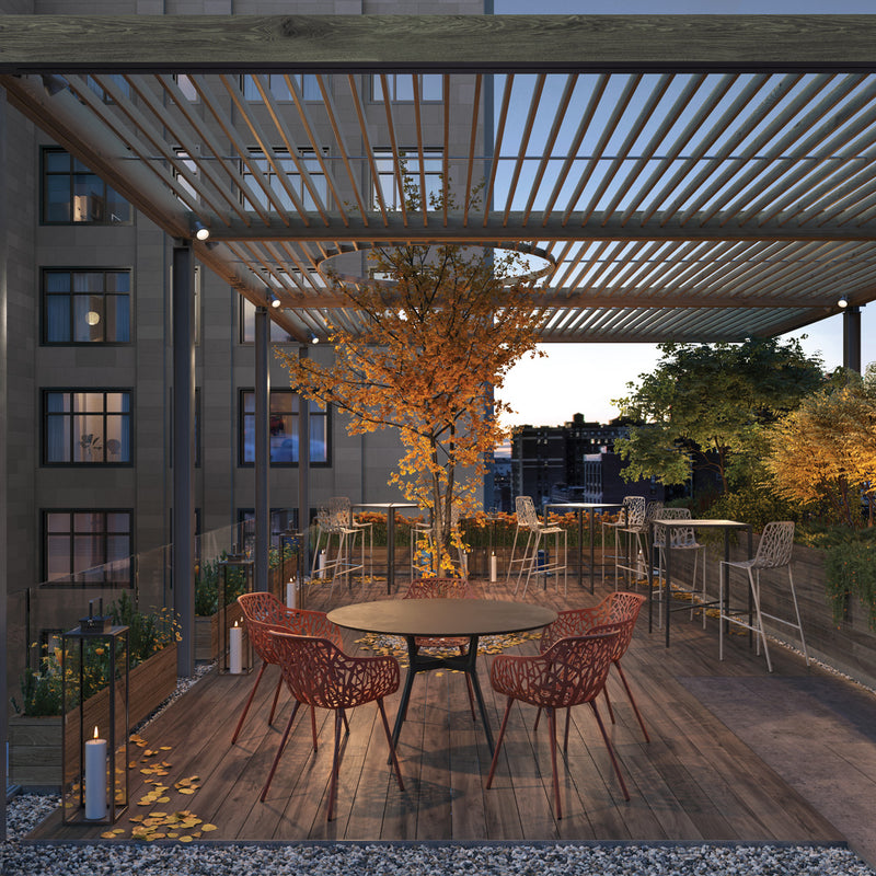 The Forest collection combines modernist elegance with nature-inspired designs. Its powder-coated aluminum structure features seats and backs with die-cut, branch-like patterns. Available in a range of colors, Forest includes armchairs, lounge chairs, stackable side chairs, bar and counter seating, suitable for both vibrant and understated settings.