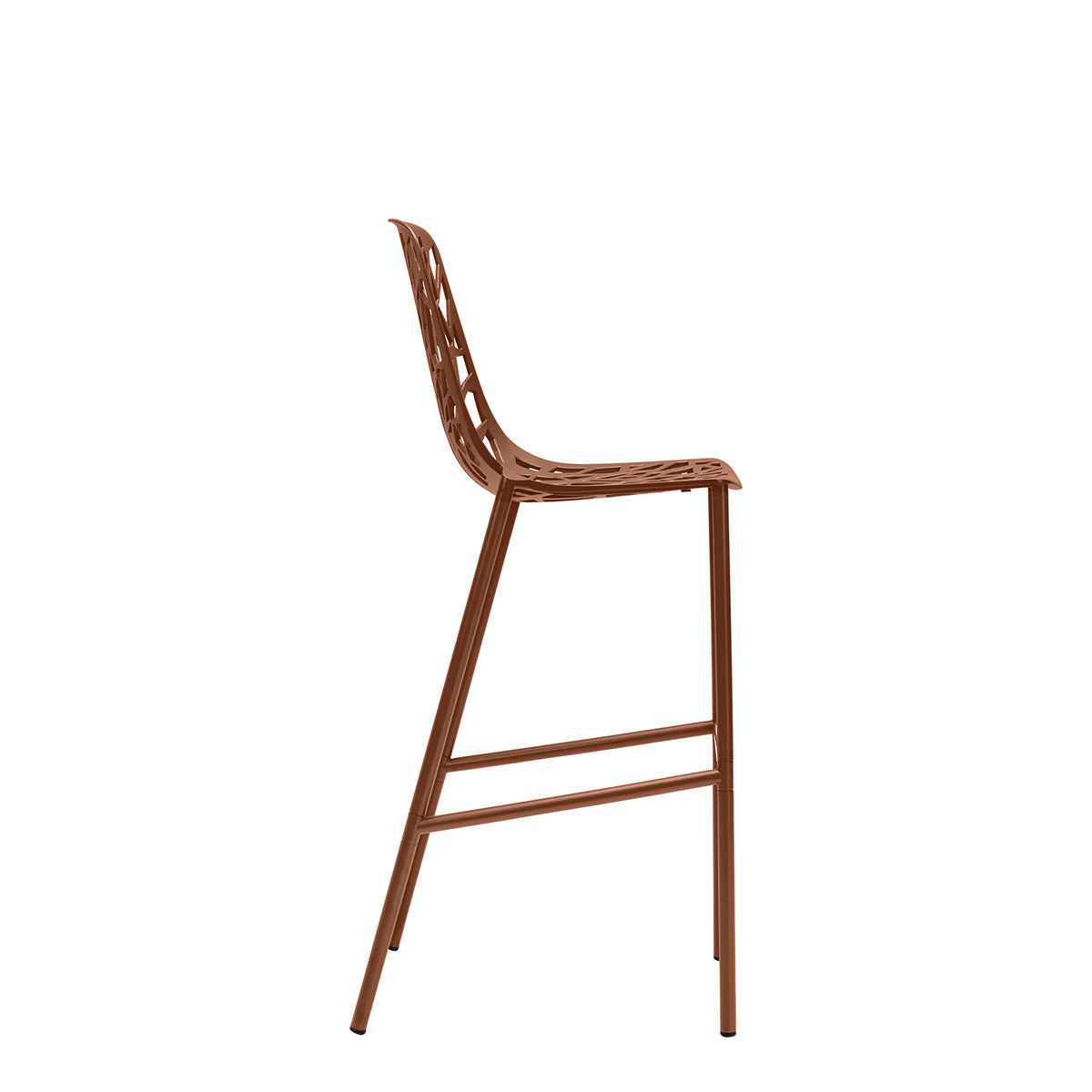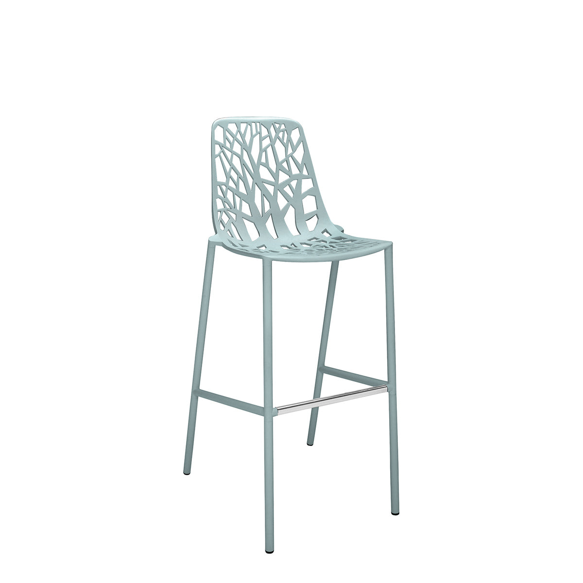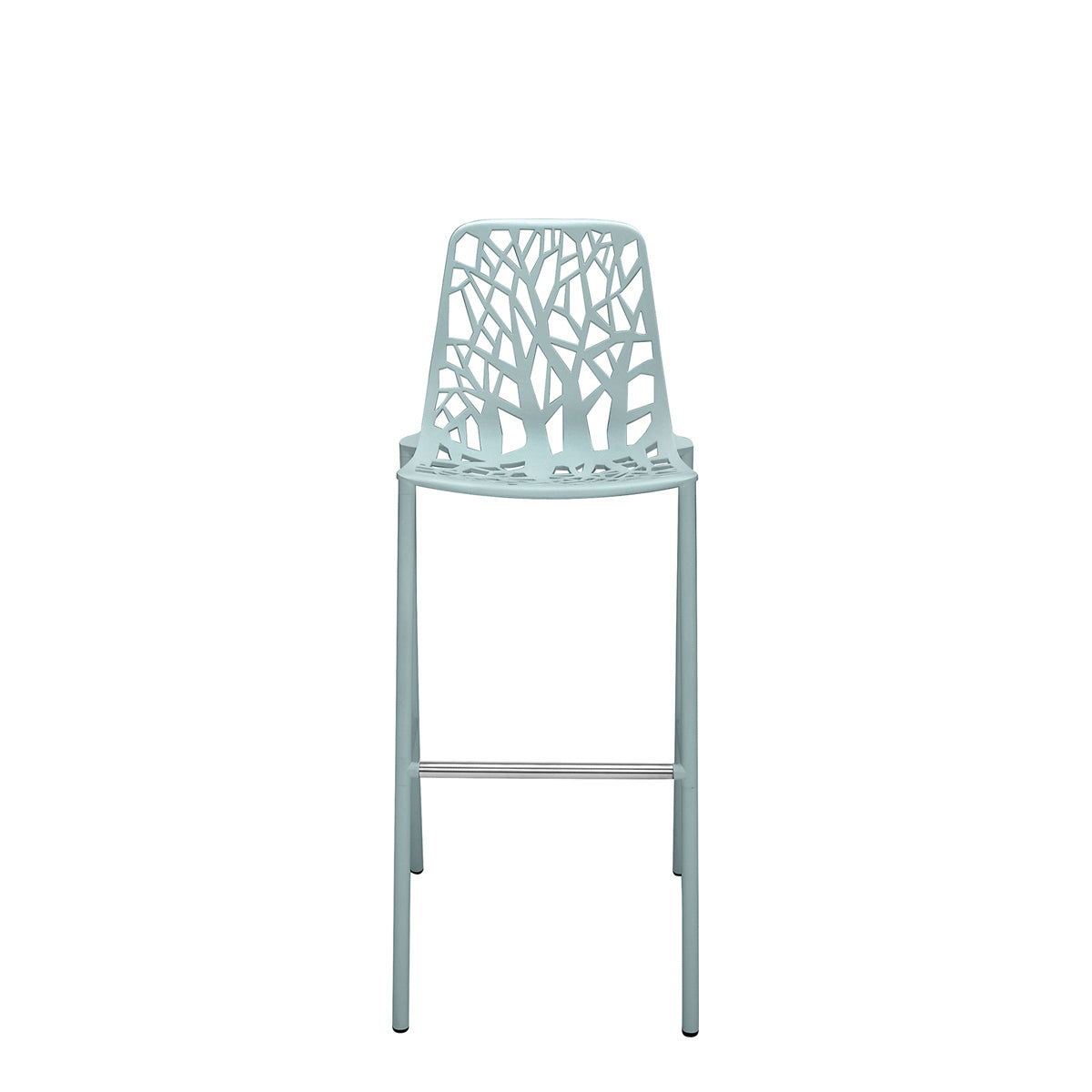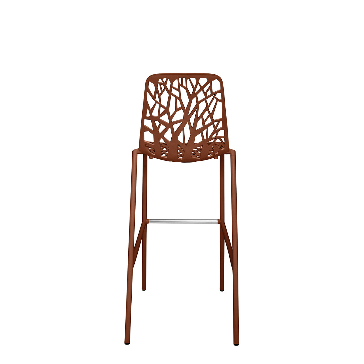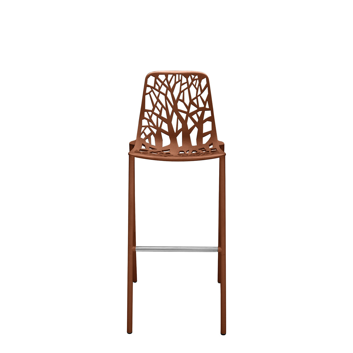 The Forest collection combines modernist elegance with nature-inspired designs. Its powder-coated aluminum structure features seats and backs with die-cut, branch-like patterns. Available in a range of colors, Forest includes armchairs, lounge chairs, stackable side chairs, bar and counter seating, suitable for both vibrant and understated settings.