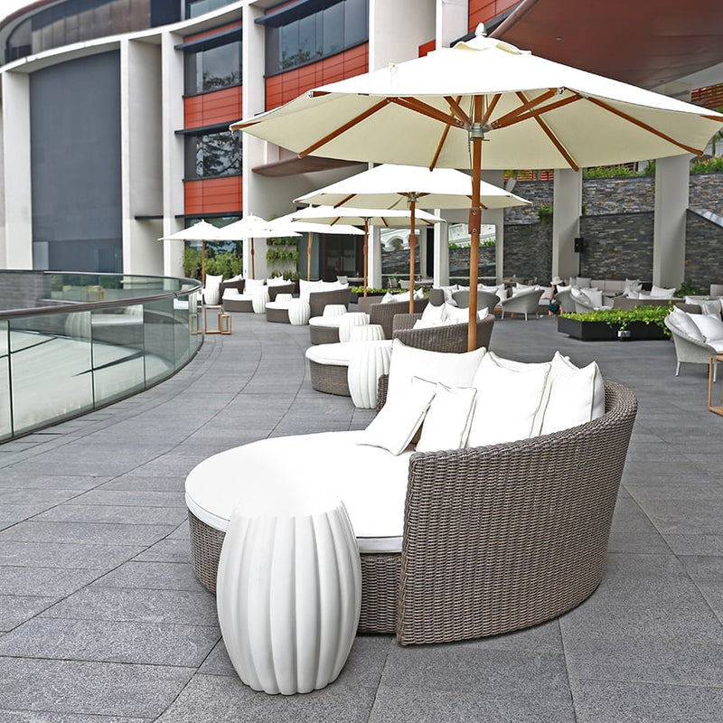 Solid Teak Frame with Stainless Steel Hardware.100% Solution-Dyed Acrylic canopy and silver powder-coated steel base with (2) Locking Casters and (2) non locking caster