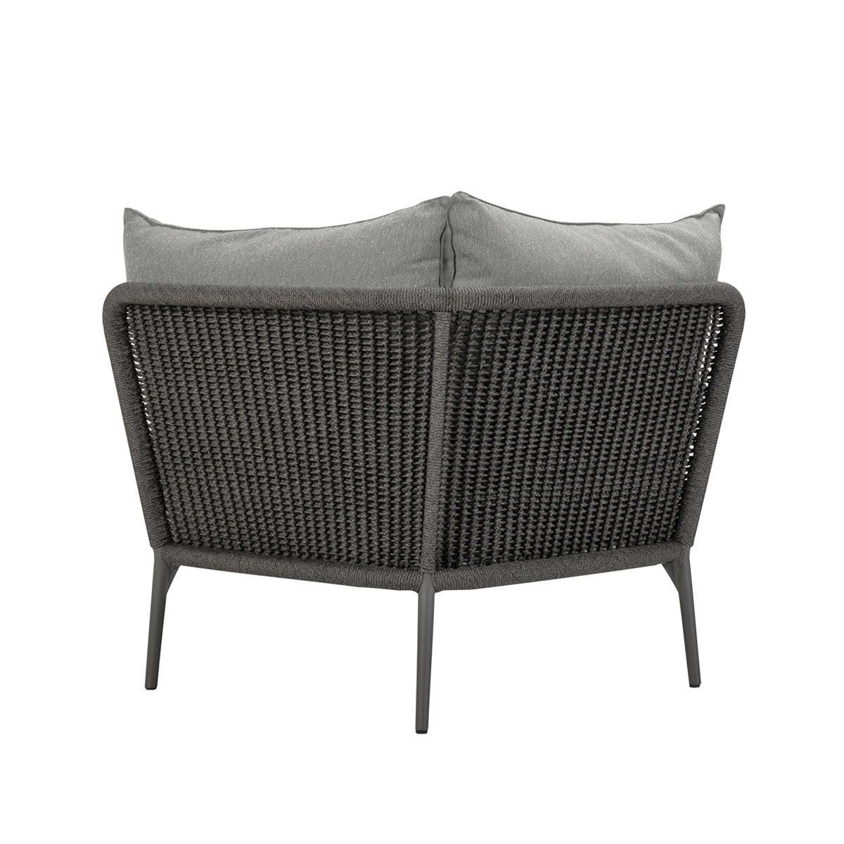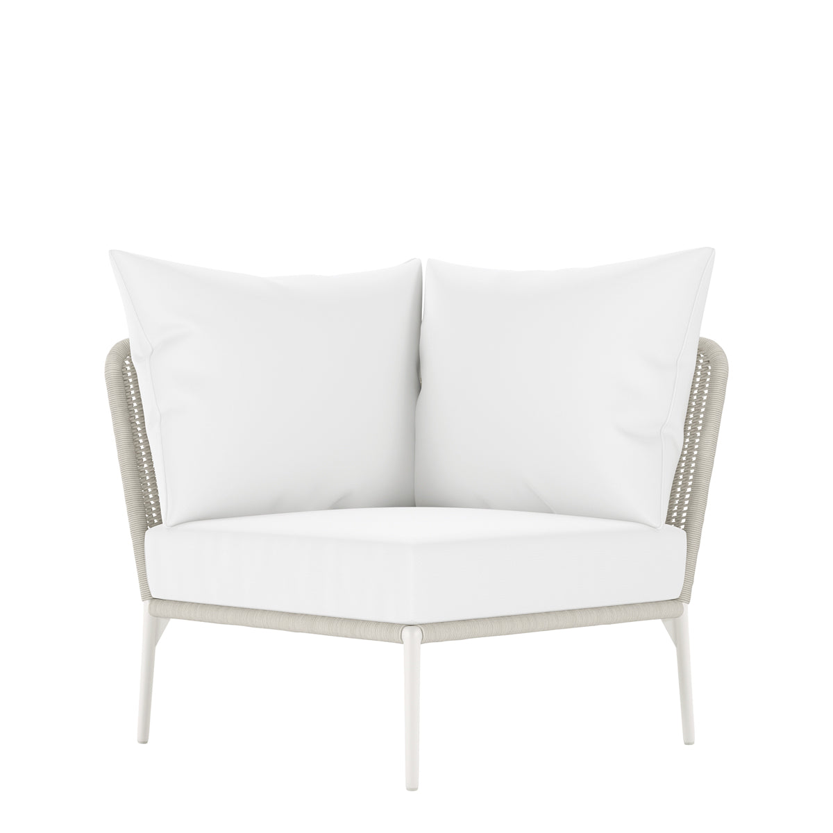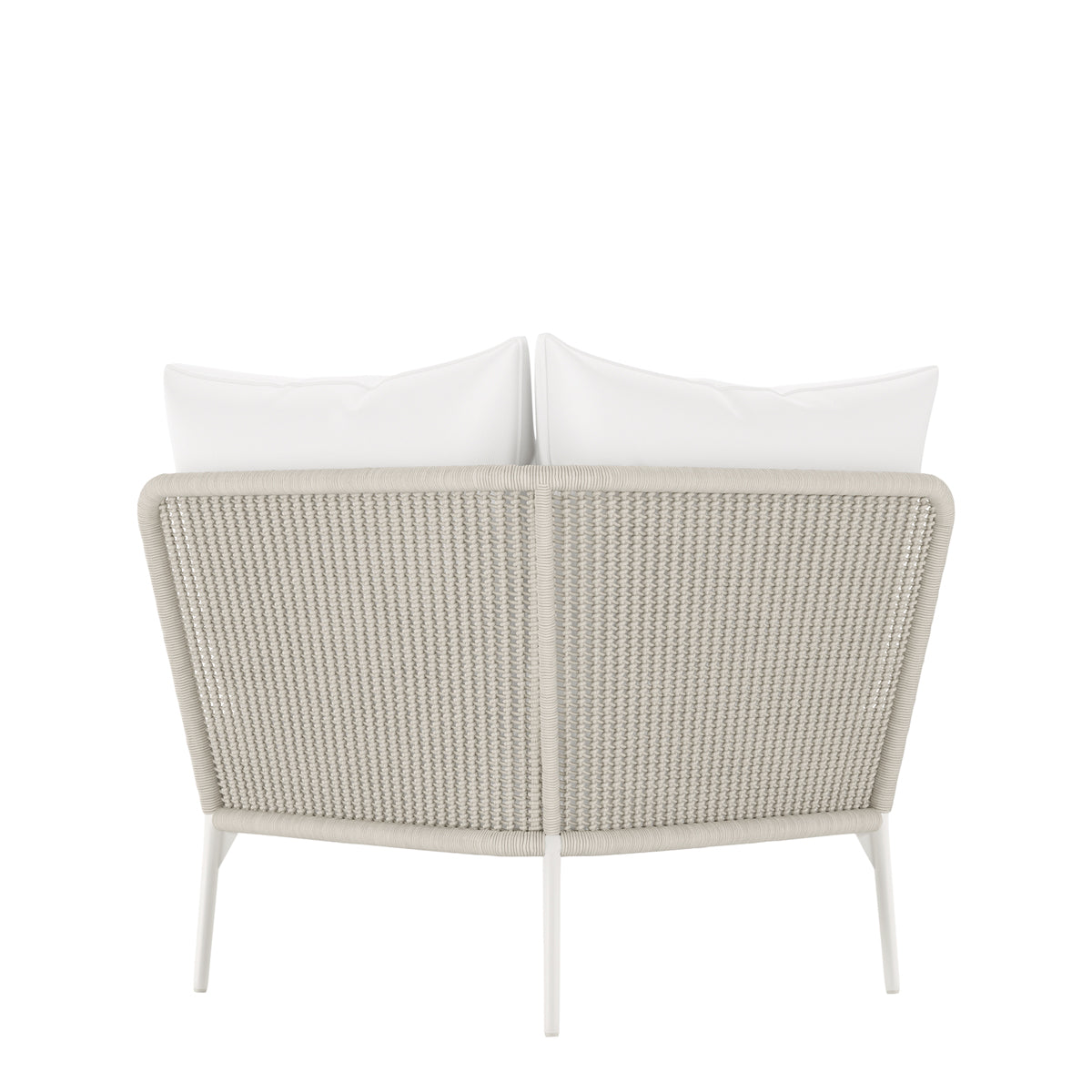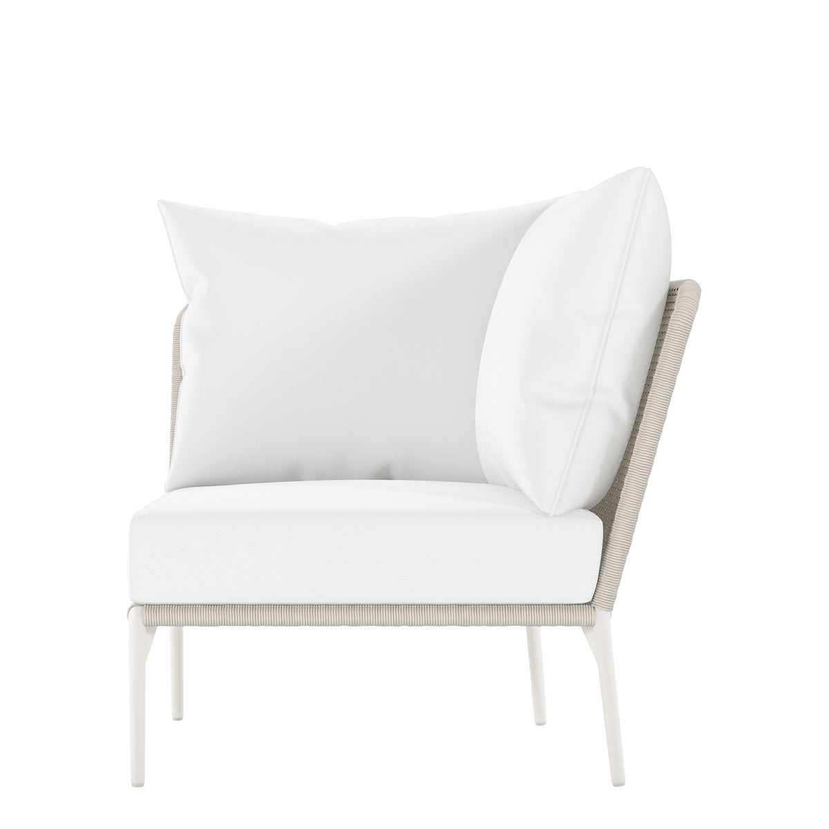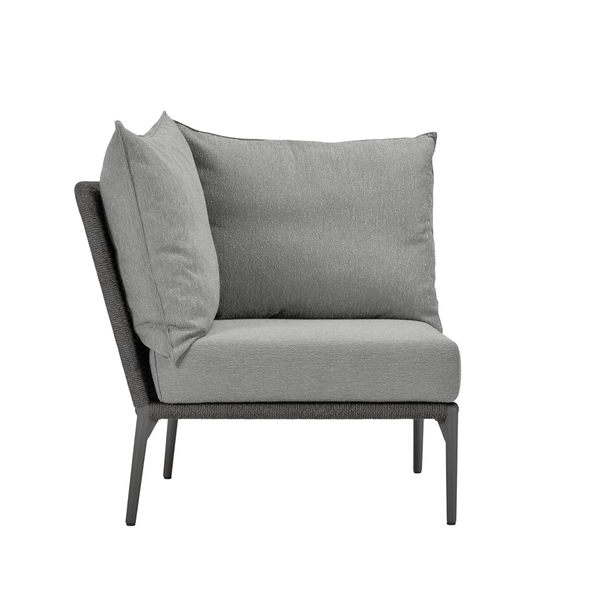 The Knot Module Corner serves as an integral connection when creating customized Knot modular seating. Inspired by midcentury modern silhouettes with spare, angled legs, a sturdy, powder coated aluminum frame provides beautiful structure and substance for intricately handwoven ropes in a reef knot-style pattern.