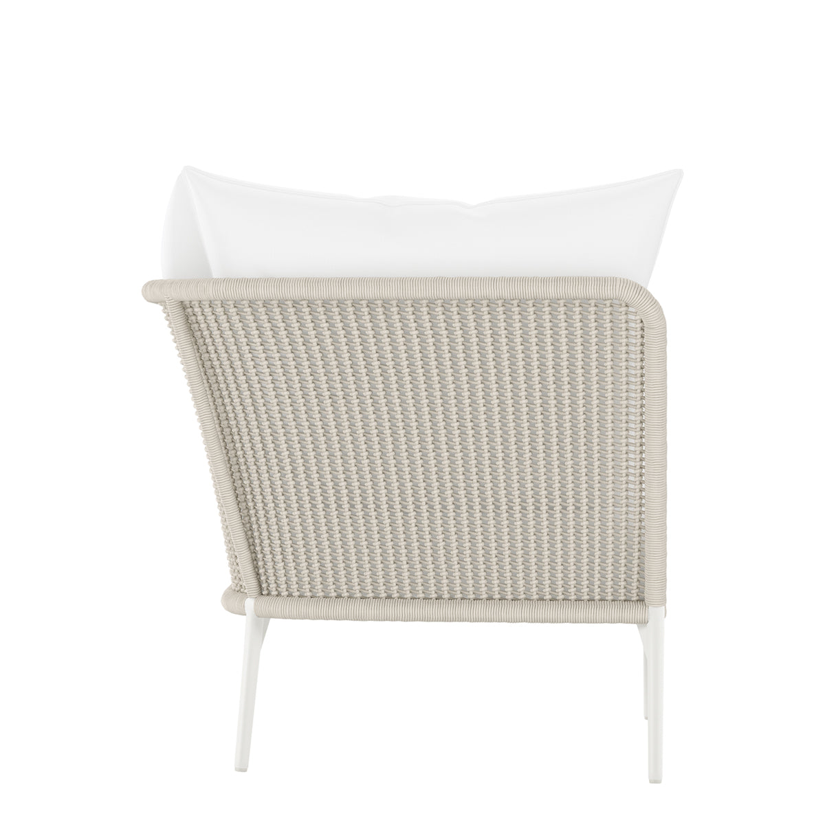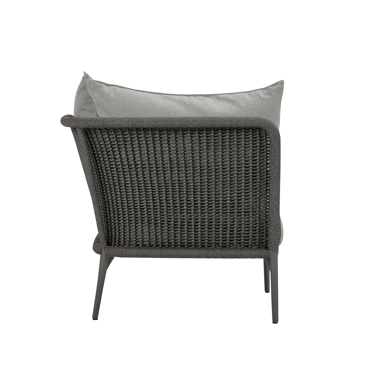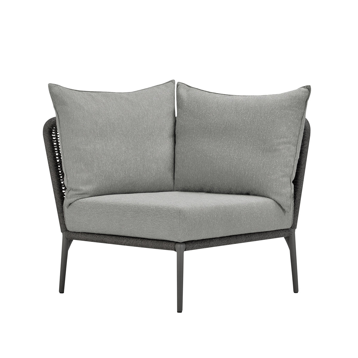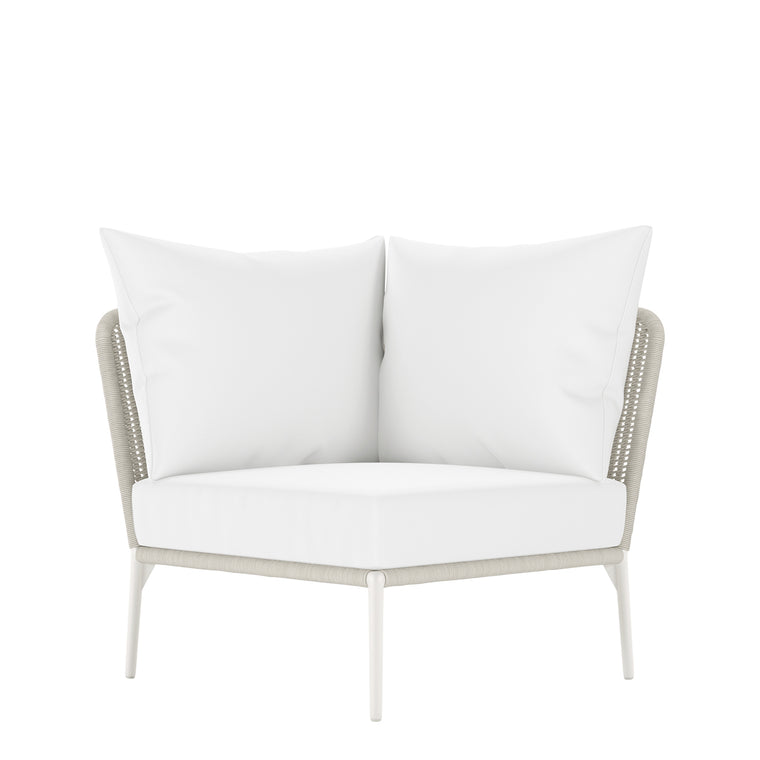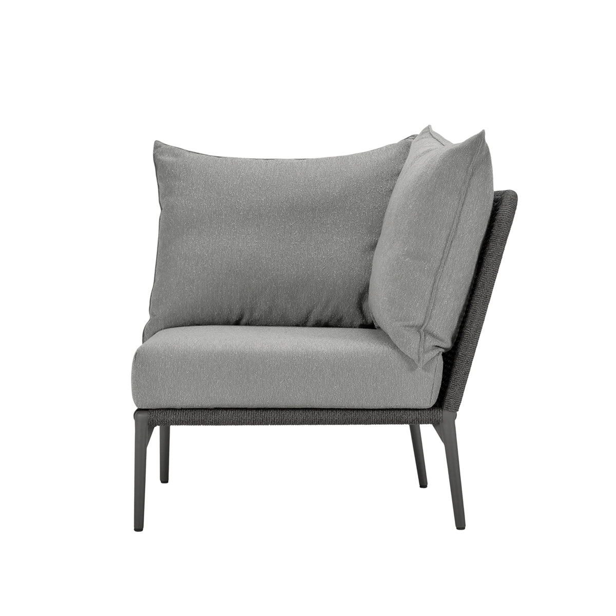 The Knot Module Corner serves as an integral connection when creating customized Knot modular seating. Inspired by midcentury modern silhouettes with spare, angled legs, a sturdy, powder coated aluminum frame provides beautiful structure and substance for intricately handwoven ropes in a reef knot-style pattern.