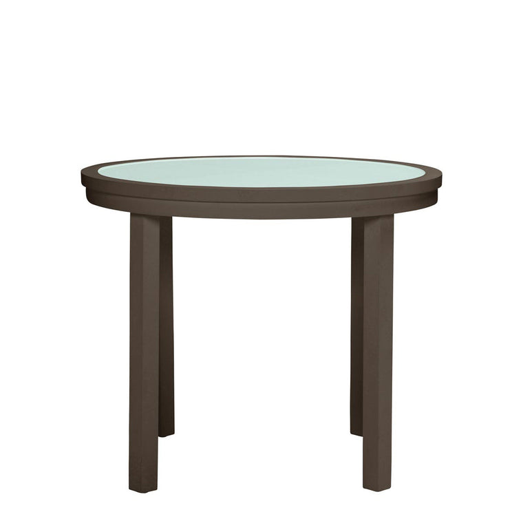 The Koko II Glass Top Dining Table is made with a JANUScoat aluminum frame and an inset tempered painted glass top. This round dining table is ideal for high traffic areas.