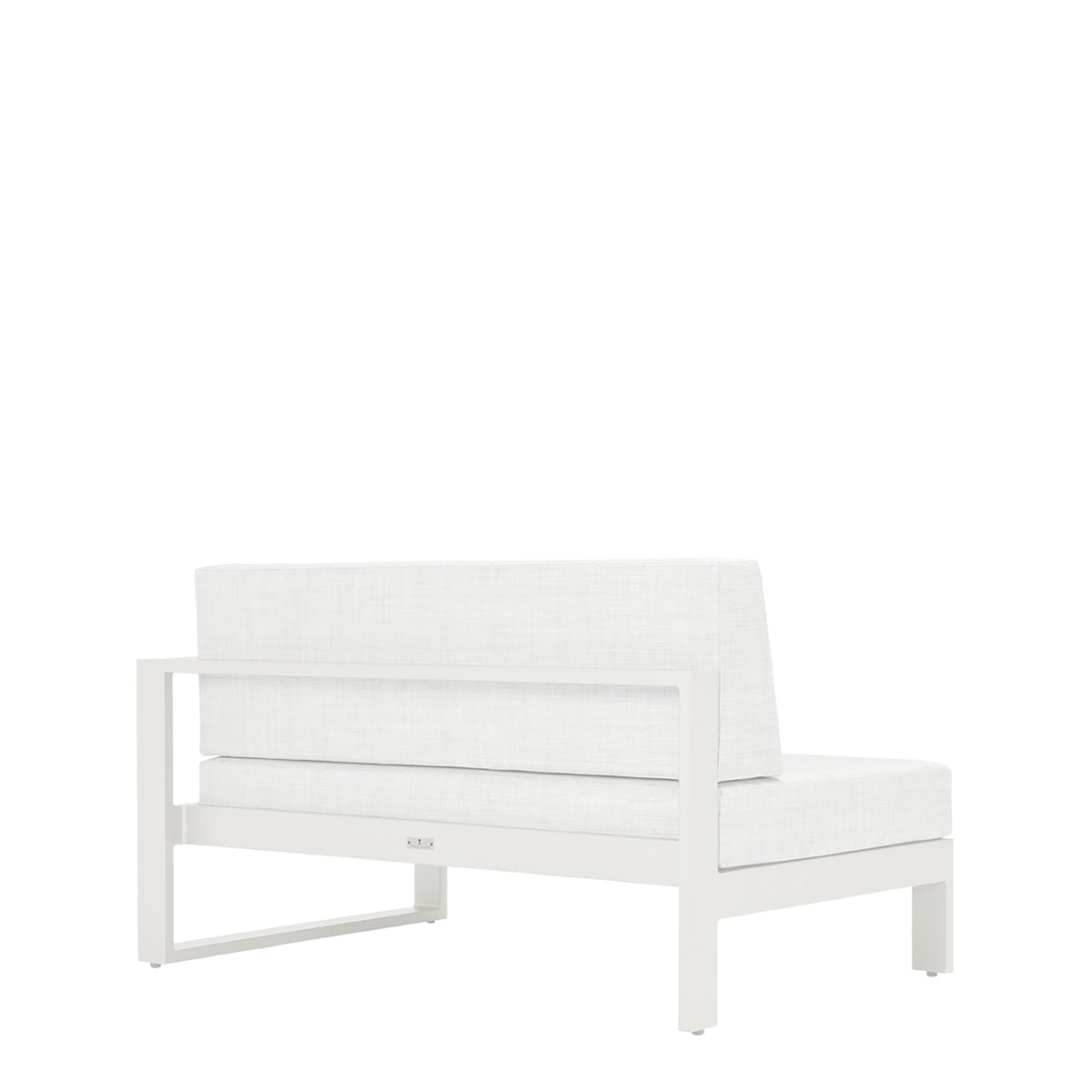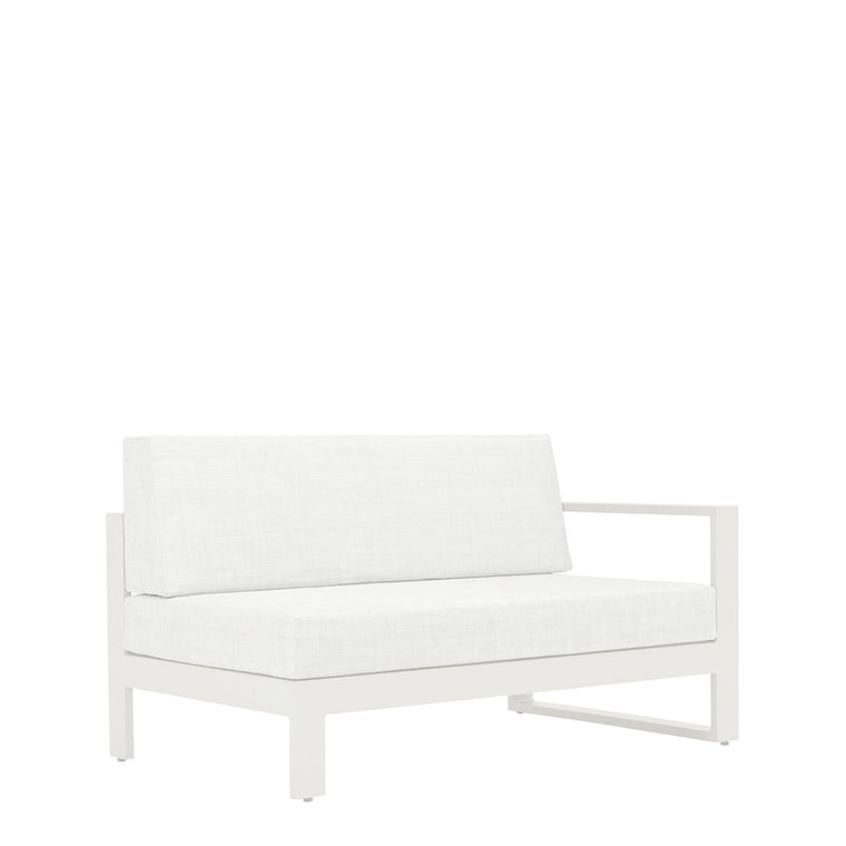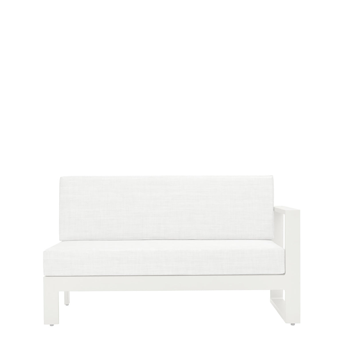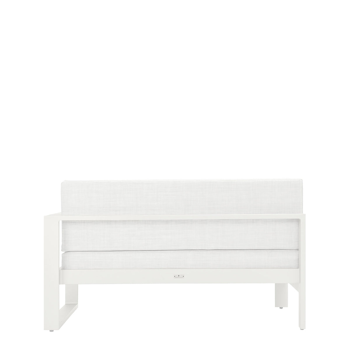 An open, squared frame at the left side of the module allows it to serve as an endpoint in endless configurations of customizable, modular seating, or the piece may be placed on its own as a recamier.