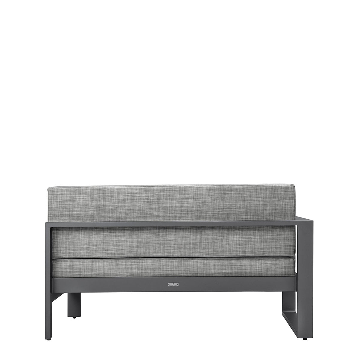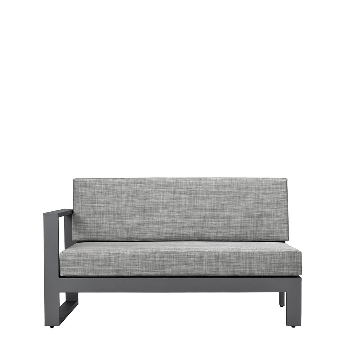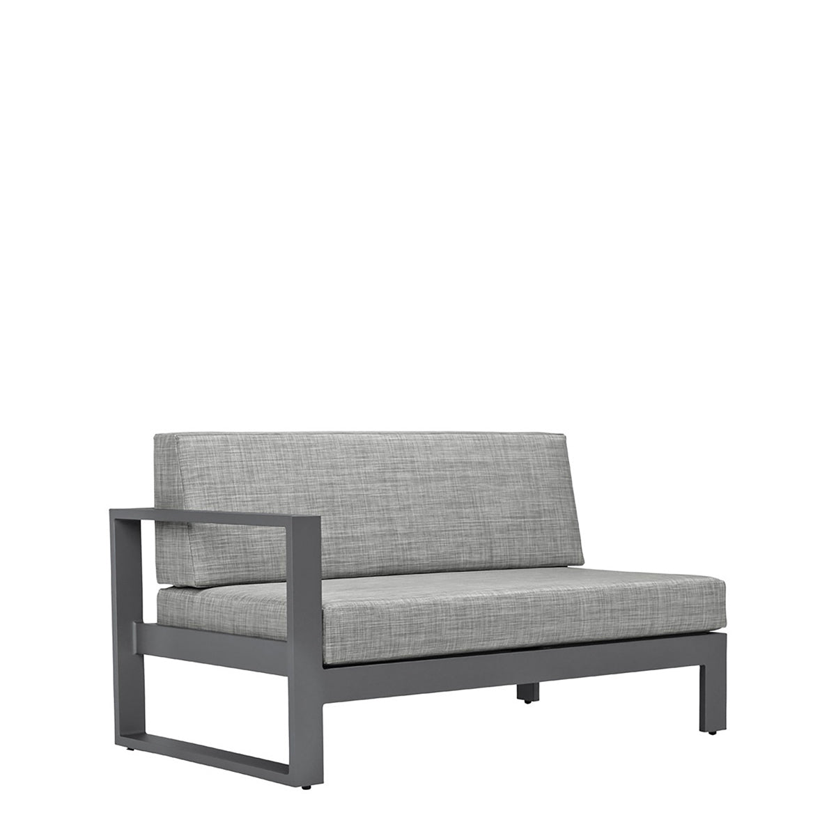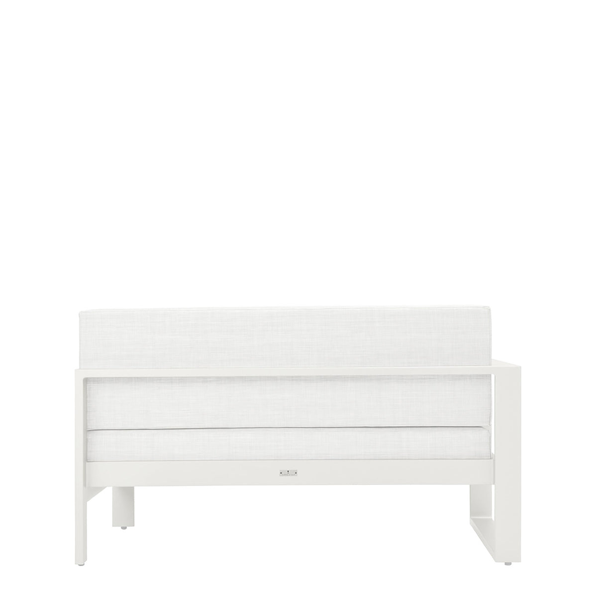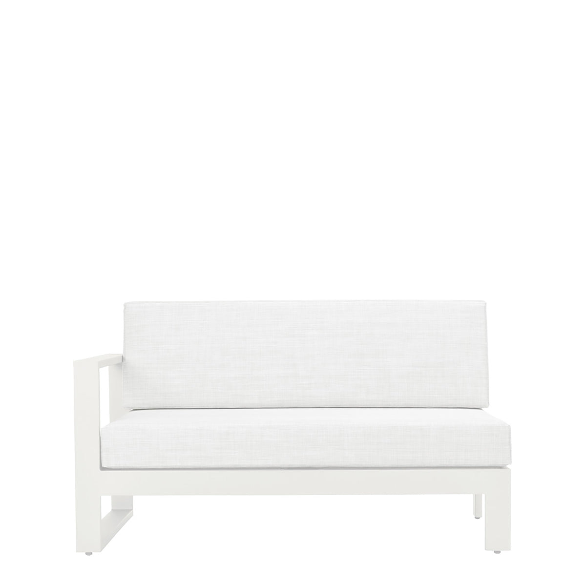 An open, squared frame at the right side of the module allows it to serve as an endpoint in endless configurations of customizable, modular seating, or the piece may be placed on its own as a recamier.