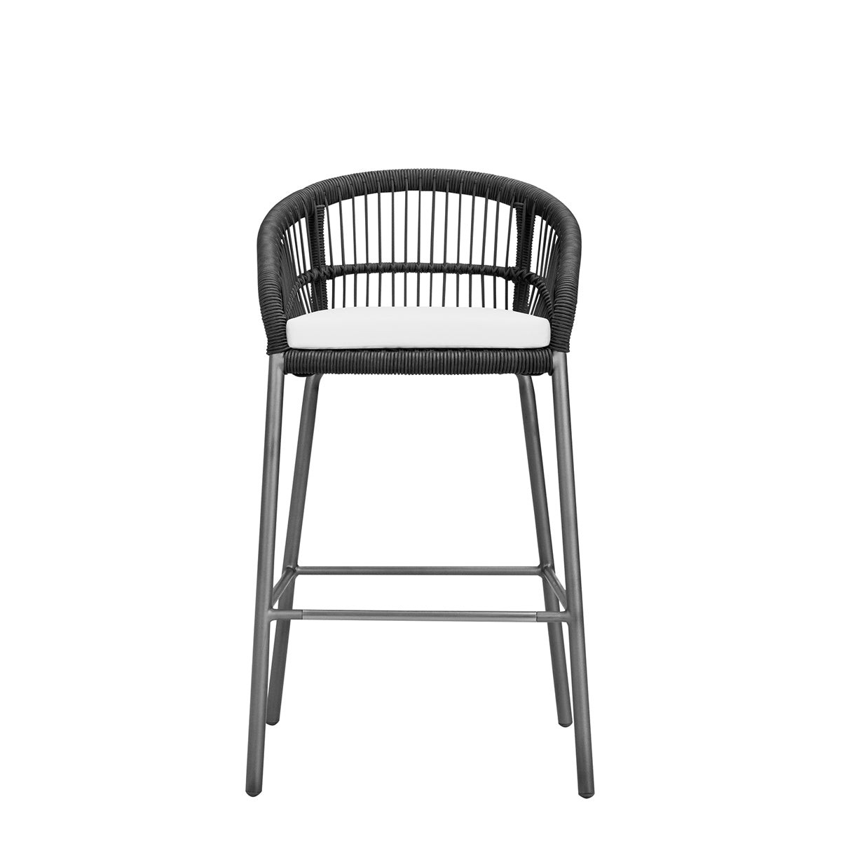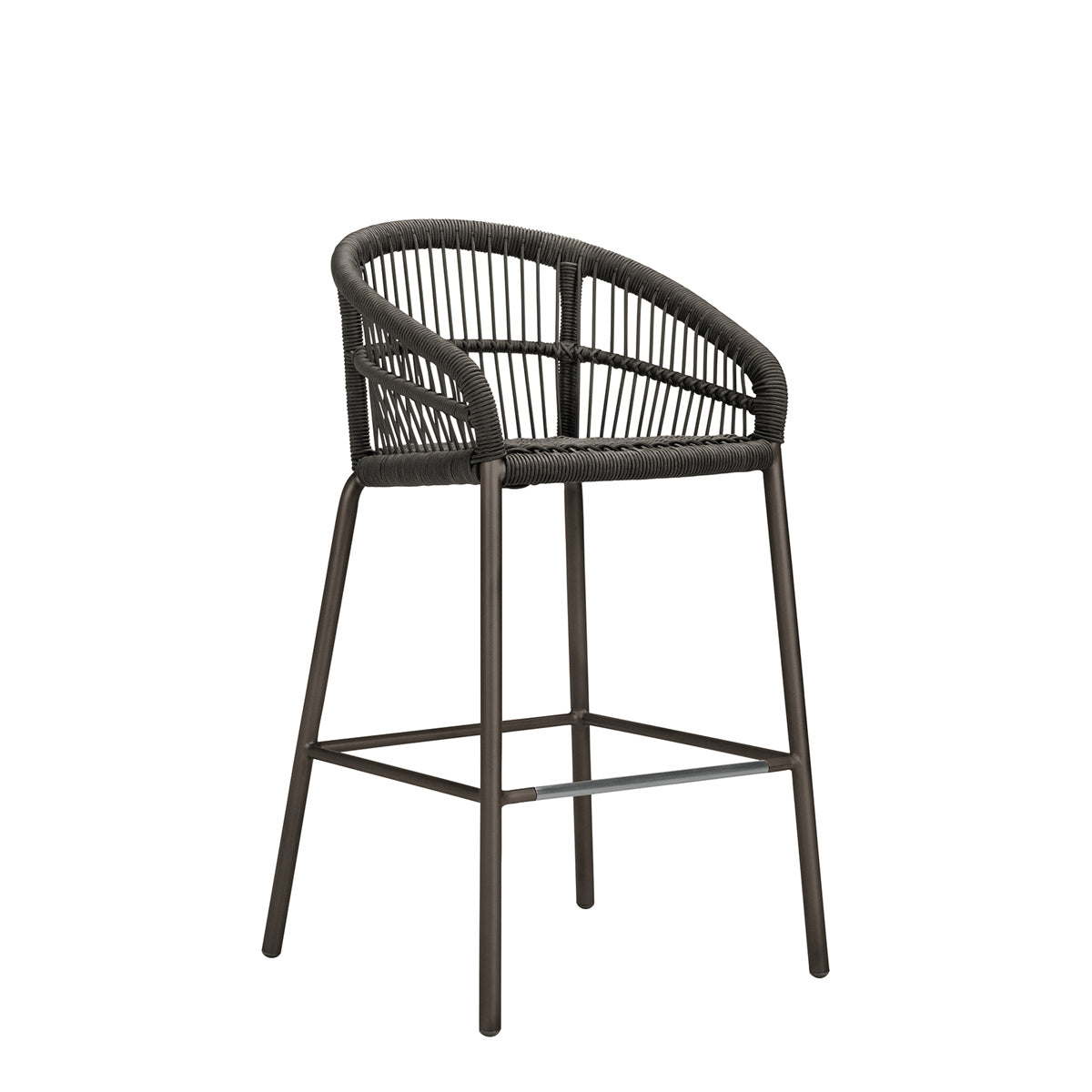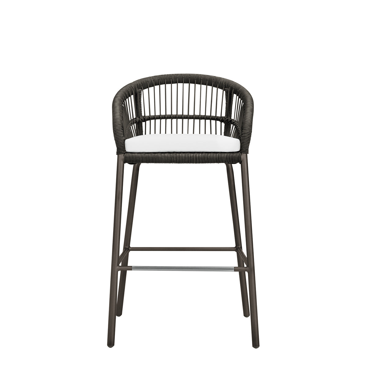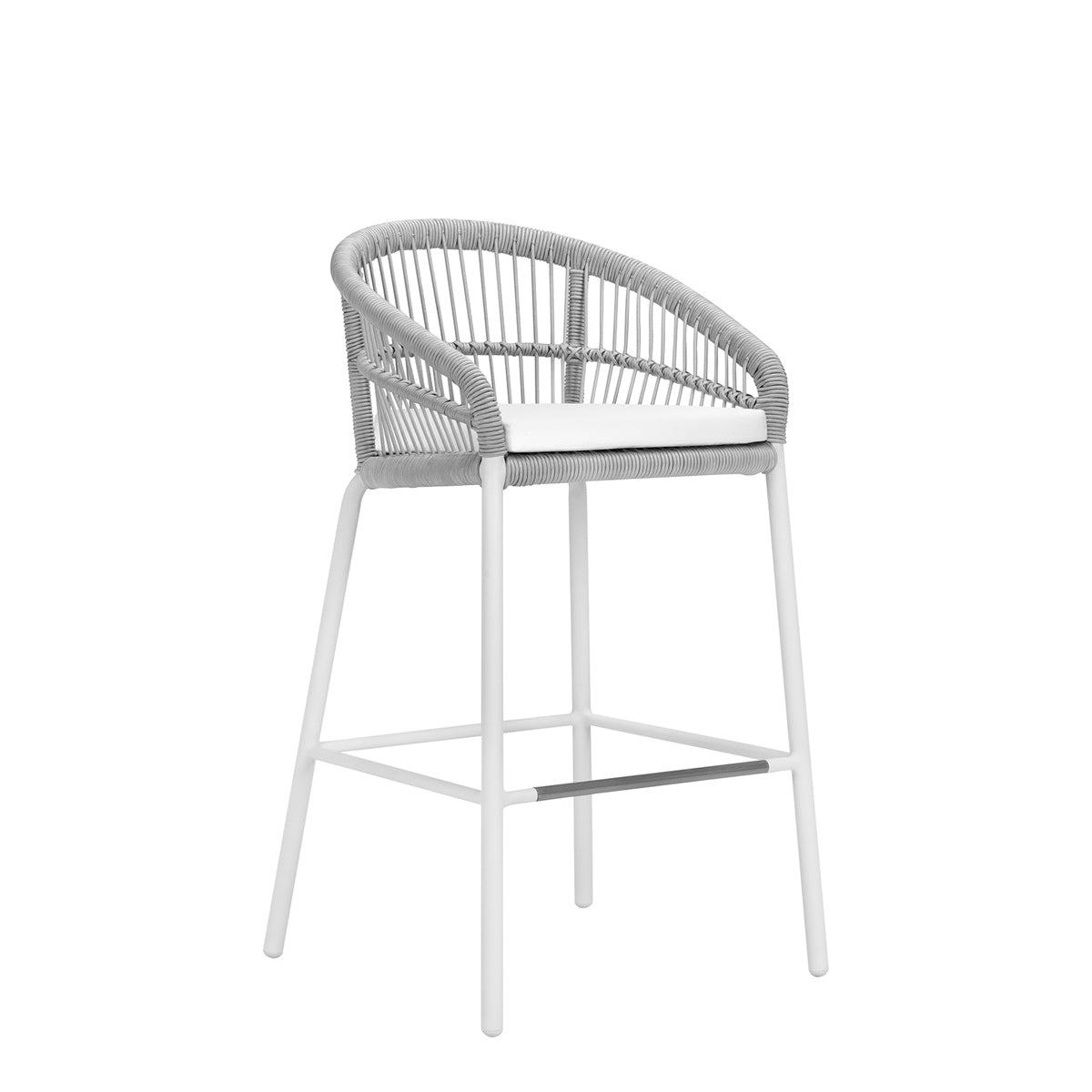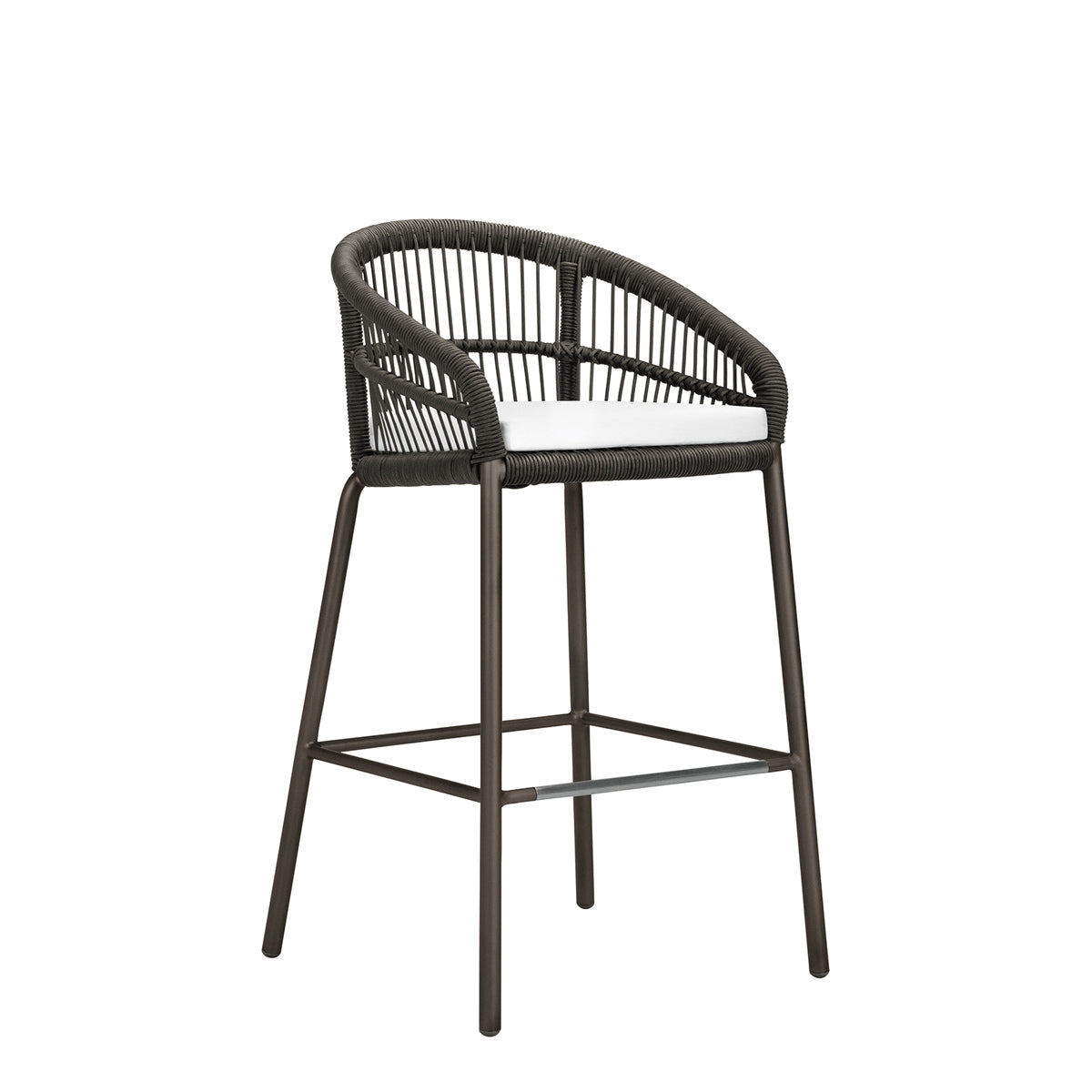 The Nexus Barstool features a powder coated aluminum frame and tightly woven polypropylene rope, echoing the contours and intricate lacings of traditional, native drums, which inspired the Nexus collection. Designed to withstand sunny, exterior settings for many years of fade-resistant beauty, the barstool’s seat and back fibers are specially treated for enhanced UV resistance, and a sleek footrest rung offers additional durability and protection. An optional seat cushion is available for separate purchase.