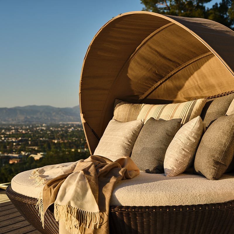 An achievement in beauty and functionality, the alluring Pivot Swivel Daybed is unmatched in style, craft, and comfort. Pivot’s expertly engineered aluminum frame supports a durable profile handwoven in JANUSfiber, while wheels allow loungers to enjoy a 360-degree view and an adjustable canopy blocks sun when needed.