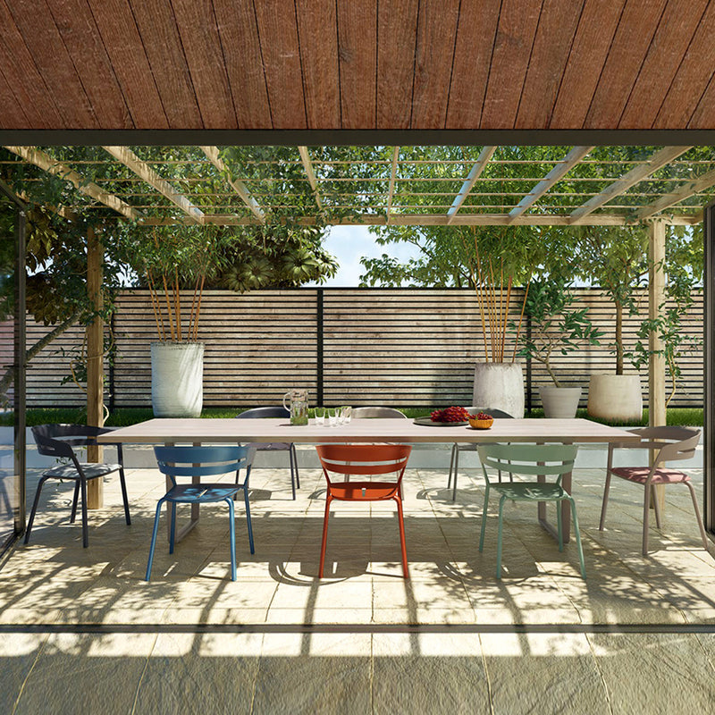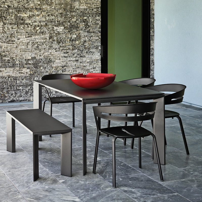 The Ria collection features clean, contemporary silhouettes in powder coated aluminum with detailed cutouts and handwoven polypropylene ropes for its series of Open Weave pieces. The collection's durable construction ensures resilience in high-traffic areas.