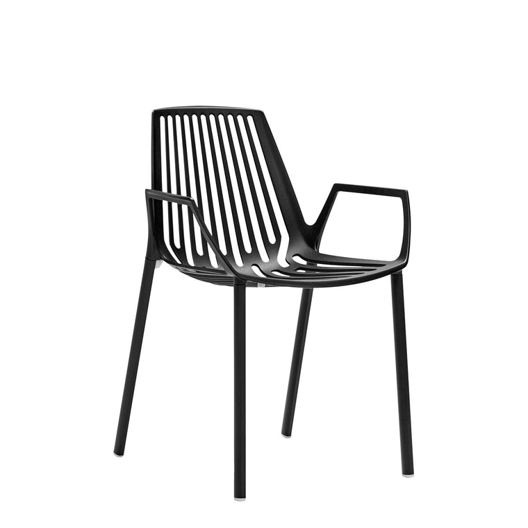Rion's modernist silhouette and graphic linear details create a distinctive and inviting seating collection. Its powder-coated aluminum construction ensures durability, making it suitable for both indoor and outdoor use, and available in a range of hues.