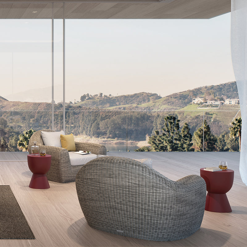 Rounded, organic forms lend a new take on classic club chair design in the Rush collection. This three-piece lounge collection's generous proportions, sweeping curves and intricately crafted surfaces command attention, while plush cushions and deep seat pitches set the tone for relaxing in luxury. Handwoven in durable, outdoor-friendly JANUSfiber, Rush pairs beautifully with a variety of woven designs while providing a pleasing contrast when accented by modern teak or metal tables.