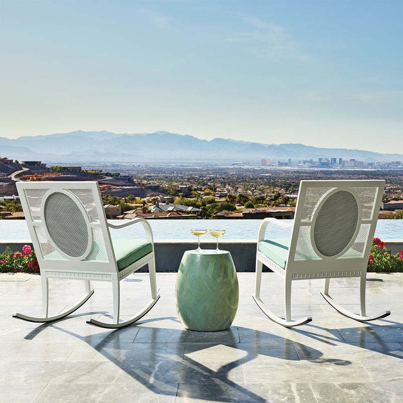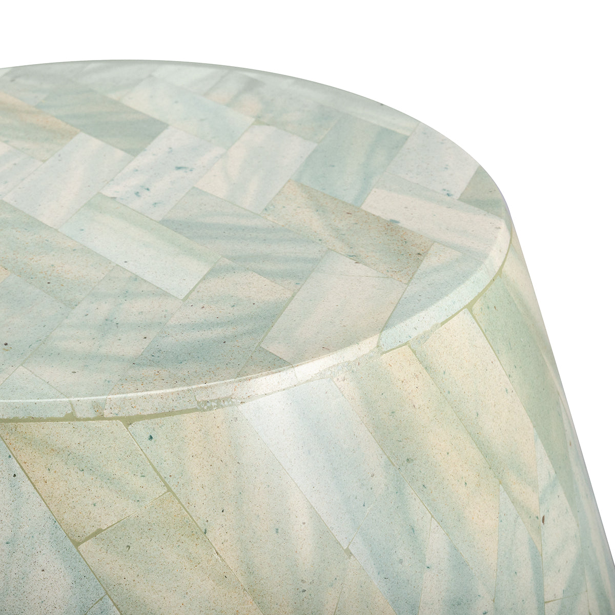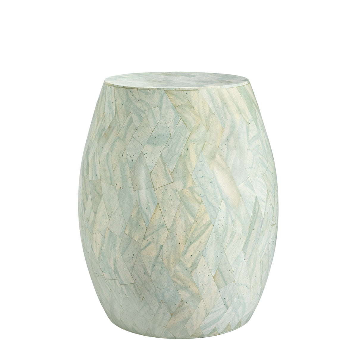 The Sandira Side Table features natural stone inlay on a fiberglass frame in beautiful sea green. This versatile table is a fitting addition to any setting.