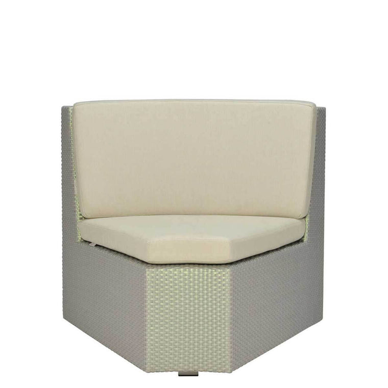 Created for JANUS et Cie by renowned designer and architect, Michael Vanderbyl, the SEE! modular lounge collection evokes the casual elegance of the California coast. Clean-lined simplicity is complemented by our proprietary UV- and wear-resistant JANUSfiber, handwoven over sturdy, powder coated aluminum frames. A juxtaposition of straight angles and rounded corners, options for modules of varying lengths, and a choice of closed or open silhouettes, SEE! presents endless configuration opportunities to make an intriguing structural statement. SEE! is available in two versatile neutral hues: rich Bronze or Palladium, a beautifully soft taupe.