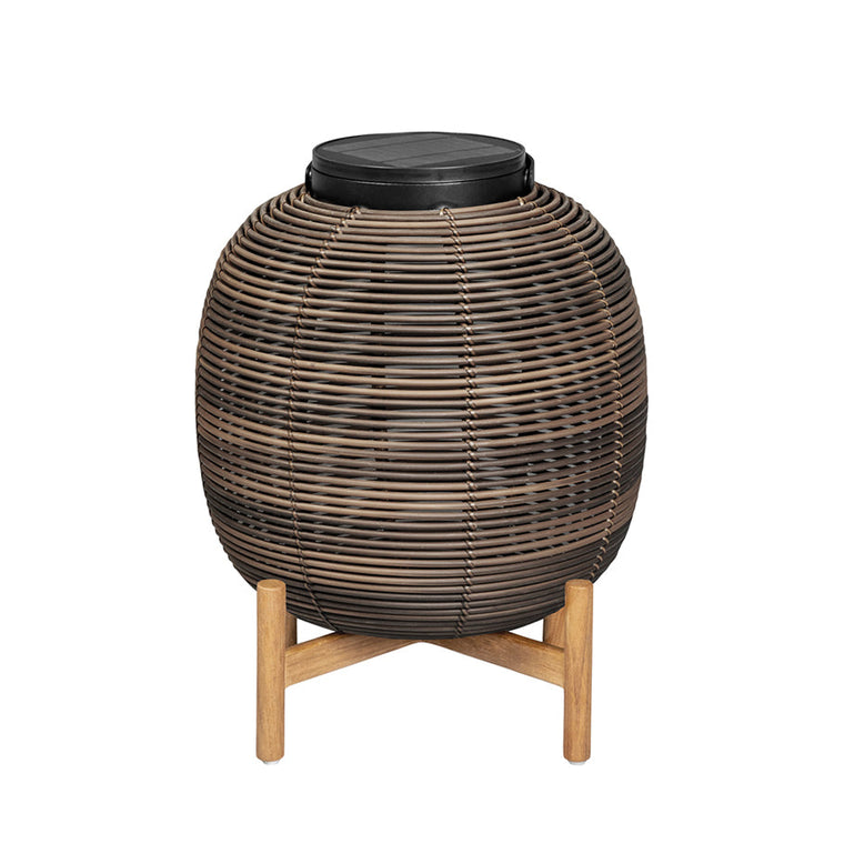 Lantern: Powder Coated Aluminum with Handwoven Synthetic Fiber. Base: Natural Premium Teak. Non-Adjustable Nylon Glides. LED Module with Light Sensor. 500 Lumens. 2700K. IP 67. Solar powered. Heights noted do not include handle.