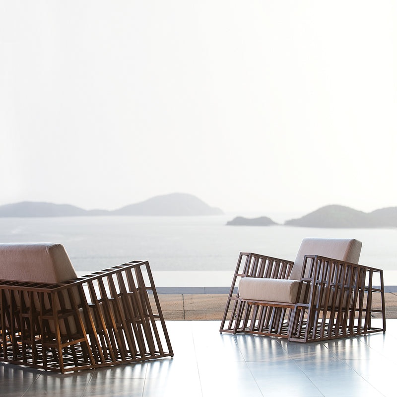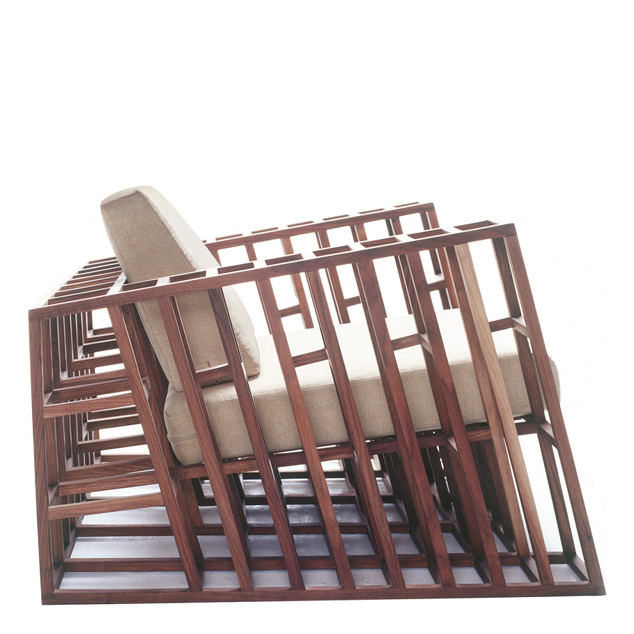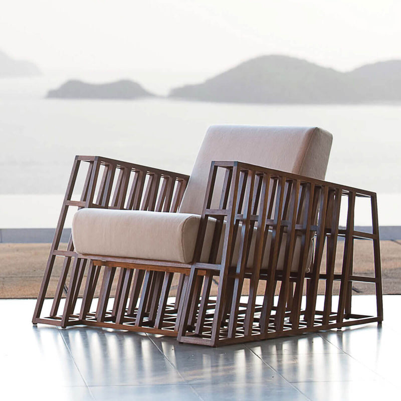 The Tilt Lounge Chair, with its natural wood frame and comfortable cushions, offers a unique tilted design for relaxed lounging. Ideal for interior use, it combines contemporary style with classic comfort.
