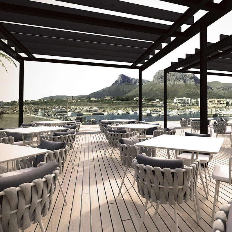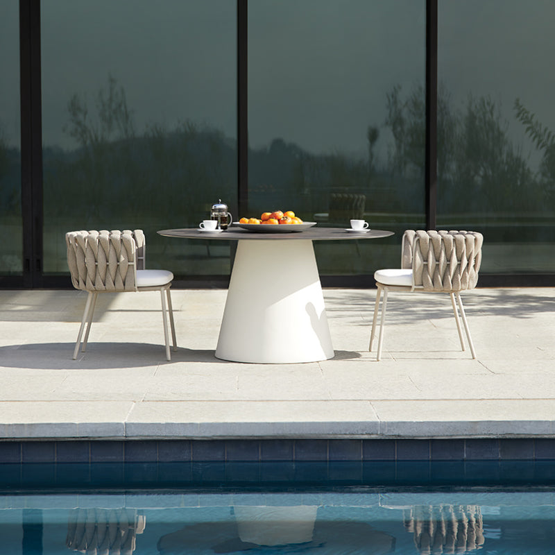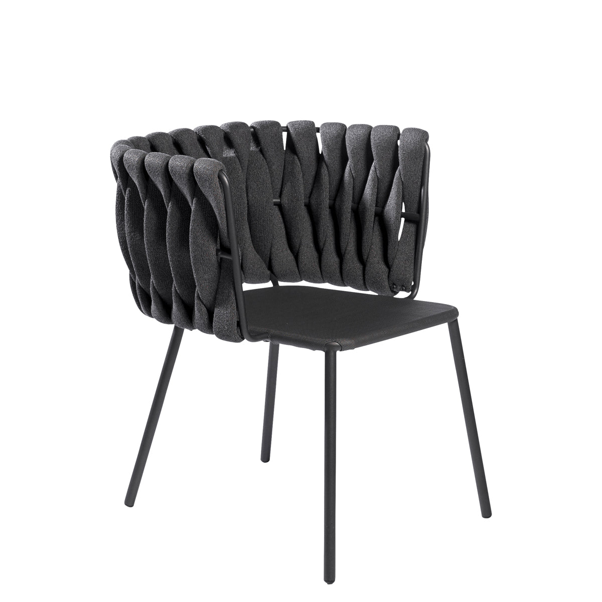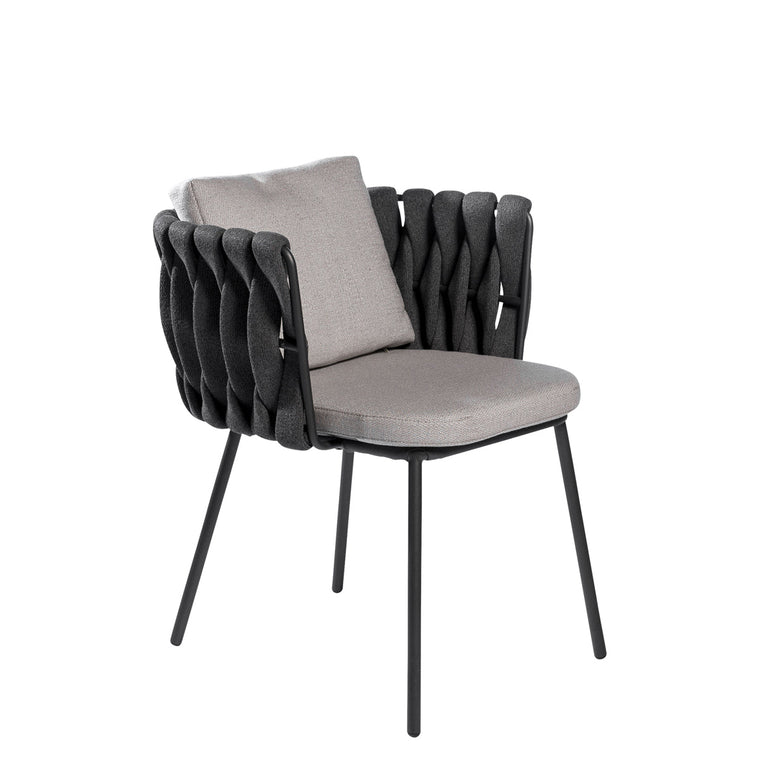 The Tosca Armchair is made with a powder coat stainless steel frame and braided textilene and polyolefin on the back.