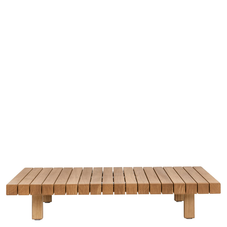 The Vis a Vis Cocktail Table, made from premium teak slats, is a versatile low table for indoor and outdoor settings.