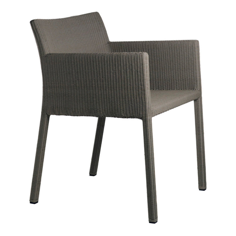 The Vitali Armchair presents a minimalist silhouette, softened by the luxurious texture of a fine gauge cordage. Handwoven in a durable, recyclable blend of hemp and PVC over a powder coated aluminum frame, Vitali offers a natural fiber feel with exceptional resistance against exterior elements. The Vitali collection is available in a choice of two neutral hues: Earth Brown, a rich, deep cocoa-taupe, and Silkgrey, a light, putty-greige.