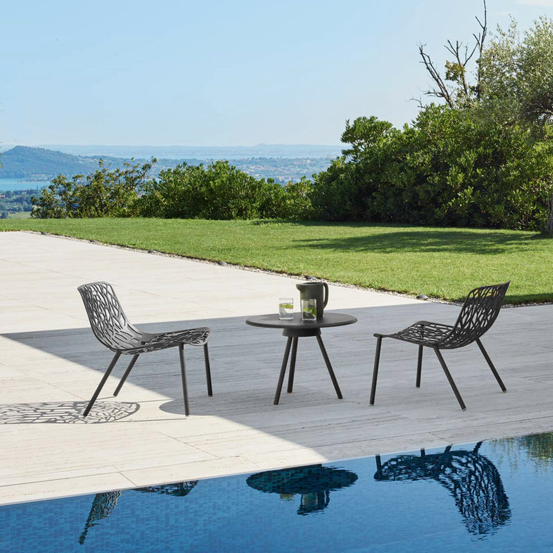 Zebra presents modernist designs with a twist of exotic inspiration. Its seating features graphic cutouts, reminiscent of a Zebra’s coat. The collection includes stackable chairs and versatile Up & Down tables with integrated wheels, crafted from powder coated aluminum and available in neutral colors.